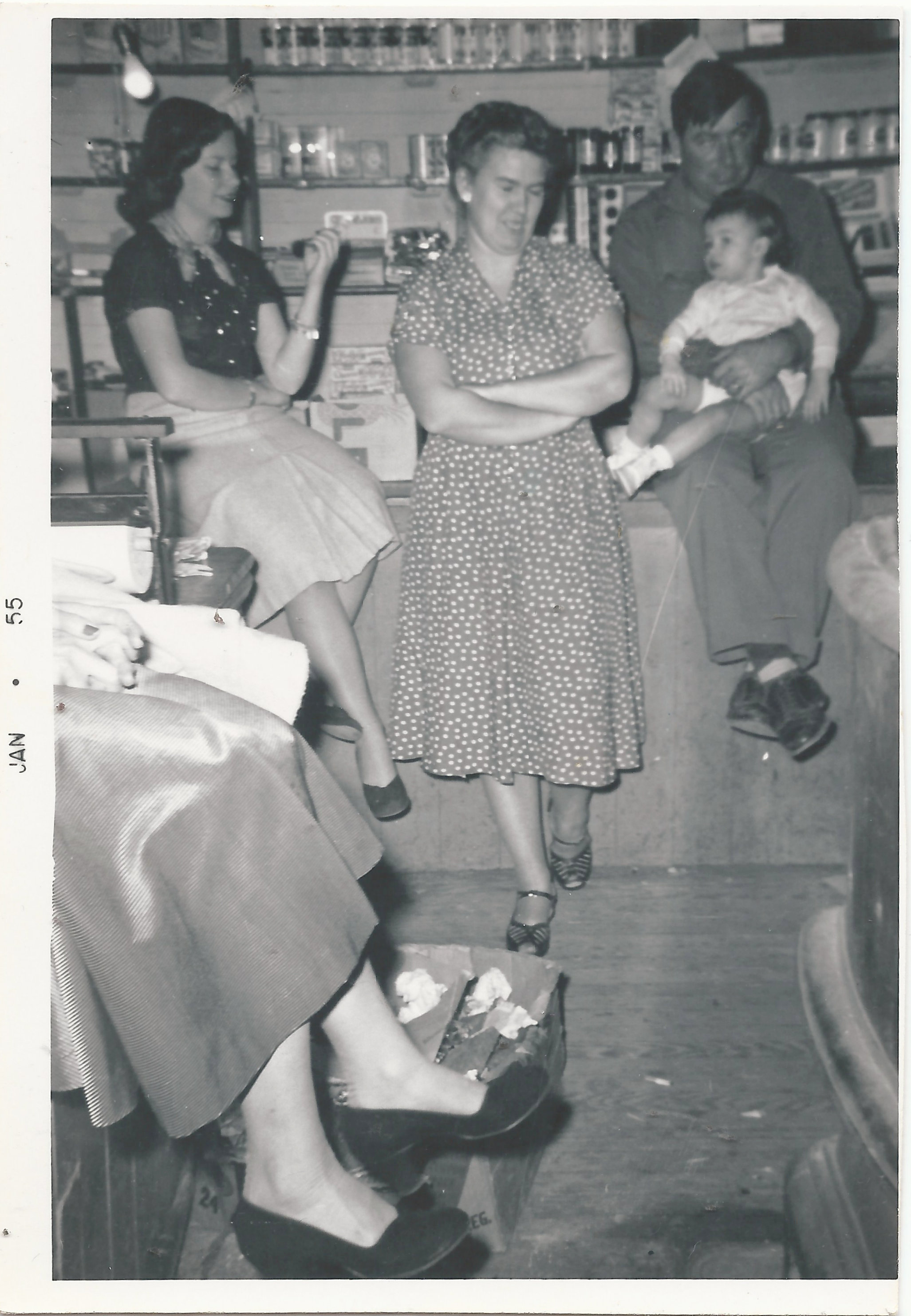 That’s Lona, as a baby, with her parents. My late sister, Rose, is sitting on the counter to the left. (Written on the back of the photo are the names and date, along with ” whose legs and feet are these?”.)  It was taken in my Grandmother’s store on Christmas Day in 1954. Beside my sister is the roll of butcher paper Grandma used to wrap hoop cheese and bologna she sold. Along with that, I also remember that old stove, barely visible, to the right.  The box on the floor appears to have torn wrapping paper on top, most likely a recently opened Christmas gift.
