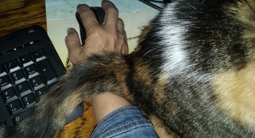 Anyway, sometimes, when she’s sitting there at the computer, I decide she needs my company. I’m not particularly choosy about where I sit. After all, I don’t really need much space.