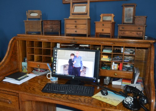 She and Motor Man purchased an antique oak roll-top desk from her uncle’s estate a few years ago, and that’s where the computer monitor and keyboard are. She also has a collection of tiny oak dressers on the top. (Can you tell she LOVES oak?)