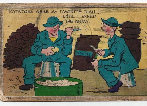 When I was very young, I asked my mom what this postcard meant:  why did the soldier lose his taste for potatoes once he joined the army? This one is postmarked January 9, 1943, and was mailed from Paris, Texas.