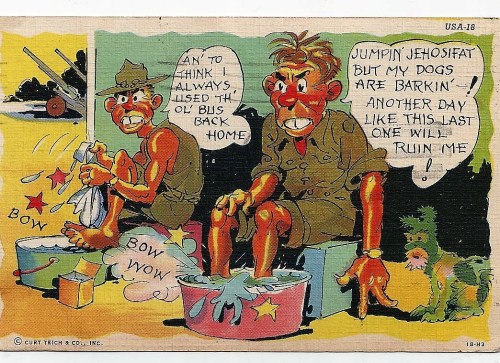 I think Mom had to explain this next postcard to me, too, since, at that time, I’d never heard feet referred to as “dogs”.  The postmark on this one is July 13, 1943, from Camp Maxey, Texas.