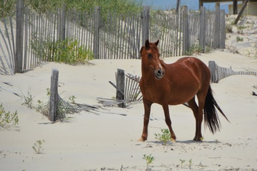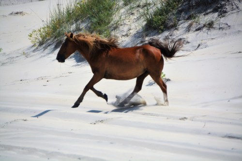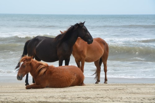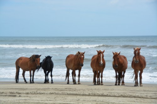 On our most recent trip, we set a personal record: the highest number of wild horses we’ve ever seen. We counted 92….ninety-two. That’s just about the entire herd. Our beach day started with this gorgeous line-up. There were horses standing by the ocean: