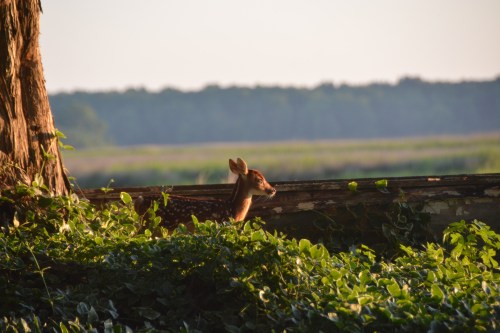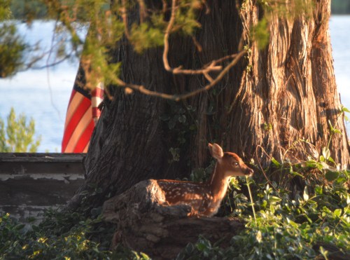 Sunday morning, I stepped out right around the time of sunrise. As I opened the garage door, I saw our resident fawns, lying in the side yard. By the time I went back inside for the camera and returned, one of them was standing.