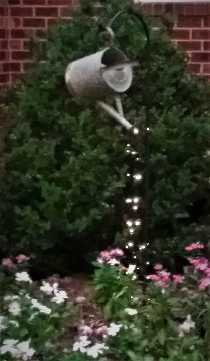 I heard her tell Motor Man that she’d seen an idea on Pinterest (whatever THAT is) where someone had taken tiny solar lights (whatever THEY are) and made them look like water flowing from the spout of the watering can.