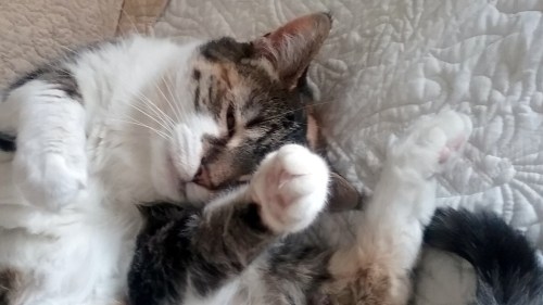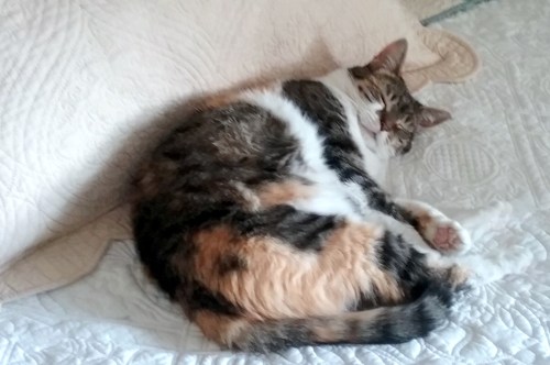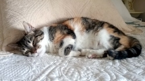 Today, I’m sharing pictures Motor Mommy took a couple of weeks ago. She came home one afternoon to find me lounging snoozing on the bed in “The Donna Room”.