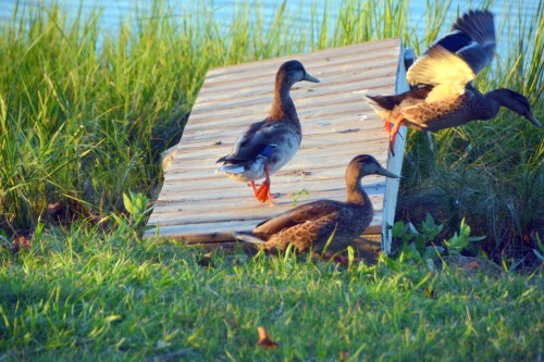2.) And now, a few duck randoms. They were here for dinner on a recent evening during golden hour: my favorite time for photos. I’m sharing this one although it isn’t perfect. Our little dock is all cattywampus from recent high tides. But I loved the one duck strolling on the dock and the fact that I caught another one taking flight.