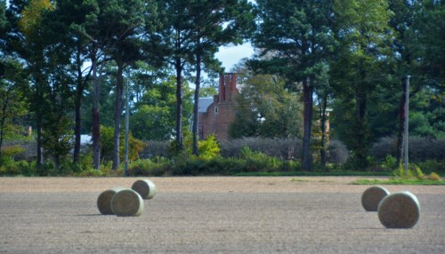 Last weekend, Motor Man and I ran an errand in neighboring Surry County. Our travels took us right through my tiny home town of Bacon’s Castle. I noticed from the main highway that a local farmer was harvesting peanuts (or we used to say: “pickin’ peanuts”) in the field beside historic Bacon’s Castle.