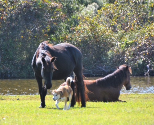 Dog: “Well, in that case, I’ll just move along. See ya later, my horse friends.”