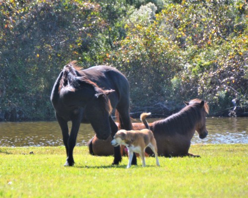 But on a recent trip, we saw something we hadn’t seen in that area before: two horses in a yard, and apparently, the property owner’s dog paying them a visit.