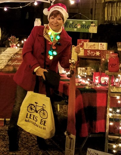 Last Friday night, our little town held its Evening Christmas Craft Market.  My friend, Donna, and I attended.  Donna believes in dressing to celebrate every occasion, so she supplied me with the light bulb “necklace”. We glowed our way down Main Street.