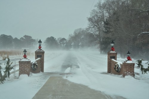 This next photo is the entrance to a dear cousin’s property, also near our house. Our temperatures have been so cold ever since Christmas, very few folks have had a chance to take down their Christmas decorations. The snow adds a nice touch.