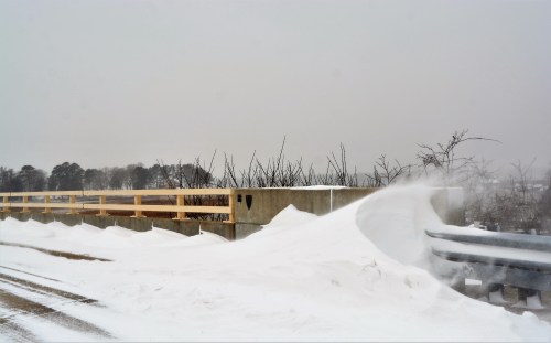 This is at a little bridge not far from our house.  The snowdrift was up to the top of the guardrail. And, as you can see, the wind was still blowing.