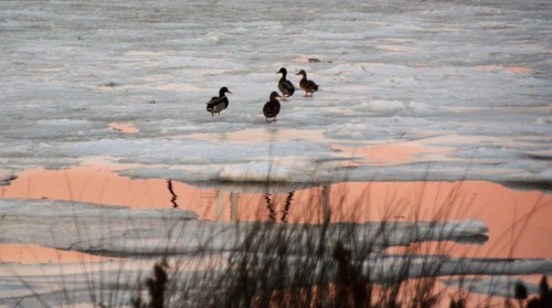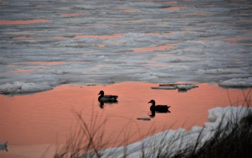 The setting sun was reflecting on a thawed area of the river, and some of “my” ducks were enjoying their little swimming hole.