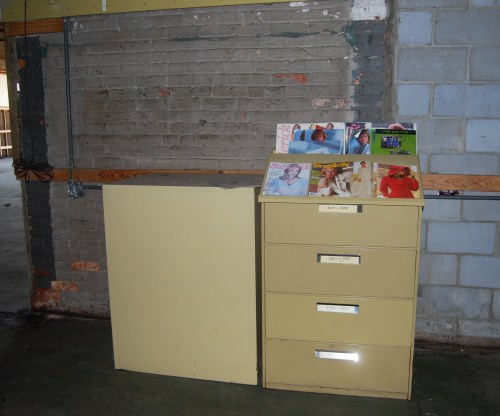 When Marshall’s dad and I owned the local Ben Franklin store, sewing patterns were a popular item. Since I was in charge of the sewing department, it was my job to update the pattern cabinets…..quite a chore when the company would send us a new pattern whose number fell in sequence in the middle of one of the drawers. Several years ago, the building was sold, as well as most of the fixtures. The pattern cabinets, however, had no takers. I took this picture just before the building was demolished.