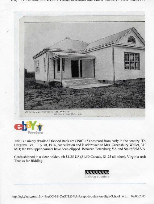 It seems that, last year, for her 90th birthday, a county resident was given a high school diploma belonging to her mother.  It was dated 1915, and was from the Joseph E Johnson High School in the Bacon’s Castle area. (I blurred out the last name of the graduate, since I didn’t ask permission to post this.)