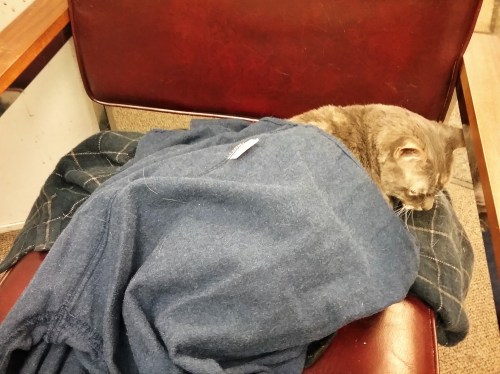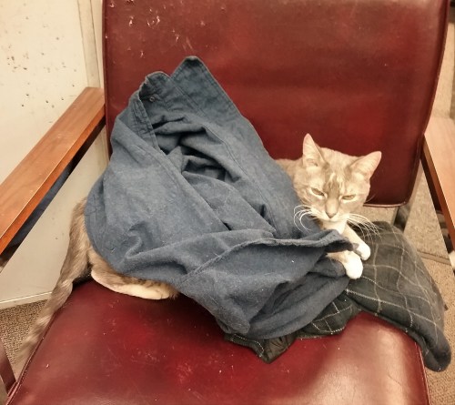 A few minutes later (after she’d gone back to her work), she looked to find that I had actually turned myself around and gotten even further under the shirt, pulling it off the back of the chair.