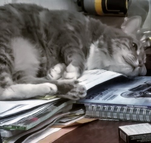 Today, I just have a photo to share with you. Motor Mommy snapped it one day last week. I was in “my spot” on Motor Man’s desk, and he was busy…I can’t recall if he was researching horsepower on his computer or on the phone talking with someone about horsepower or thinking about horsepower….but he wasn’t paying any attention to ME.