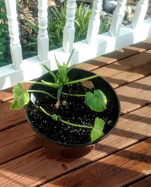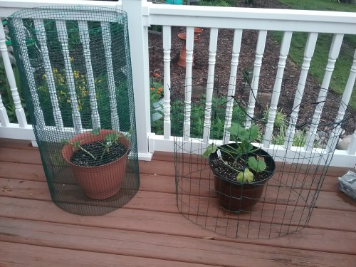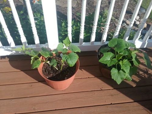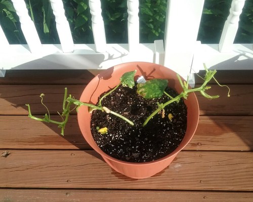 Although I’ve planted various flowers for years, and have leaned toward those that the deer ignore, I’ve never planted veggies. So this year, I decided to try my hand at “farming” and planted one cucumber plant and one yellow squash plant. I planted them in containers and placed them on our deck.