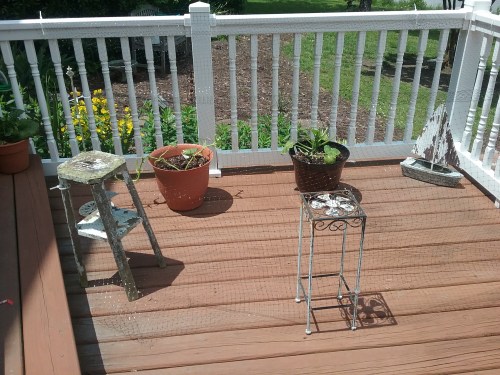 So I immediately set about rigging up netting to try to save the plants. How did we live before zip-ties? And I’m now referring to our yard as a “Gypsy Garden”. You may recall my efforts to save the plants on the other side of the deck railing this year have been successful.