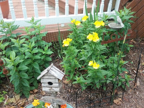 AND…that has paid off.  Well, I have flowers blooming, but they aren’t phlox. I posted this picture yesterday on FB, asking for help identifying the yellow plant.  My schoolmate (and birthday twin), Marilyn, came through for me and said it’s a primrose. I don’t recall planting THAT, but what a beautiful surprise. Now, hopefully, the plants on the left are my phlox.  And my netting is at top capacity, so if this foliage grows any taller, I will have to revamp my blockade.