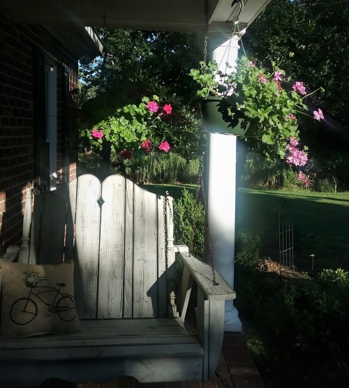 1.) Every summer, I buy hanging baskets of geraniums for our front porch. If I can find them, I prefer the ivy-leaf variety with the variegated blooms. This year, I purchased them from a different location than in the past, and they’ve been prettier than I can ever recall. (I have been very faithful in watering them regularly.)
