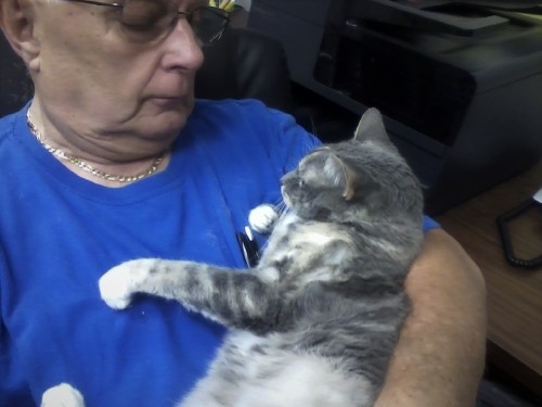 And Miss Gypsy, in one of her favorite spots….loving up on Motor Man. When she wants attention from him, she sits on his desk with her back to him, staring at the wall. No matter how busy he is, he usually caves in. She started this when she was just a kitten, and although she’s five years old, still just wants to be held like a baby. (But only by Motor Man…they do have a special bond.)