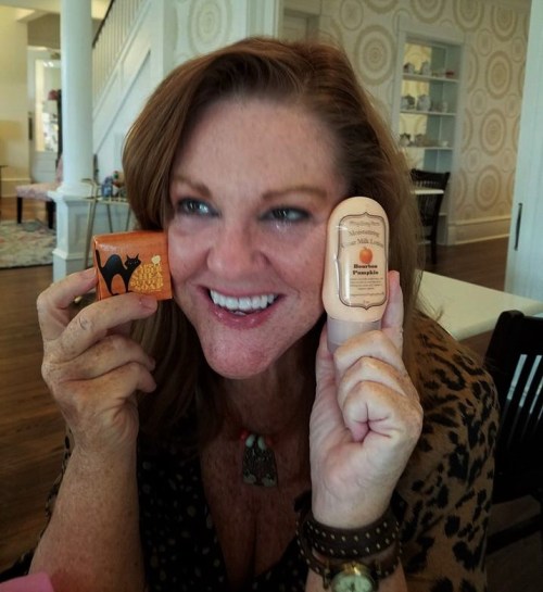 Saturday morning, the three of us had breakfast in the hotel’s beautiful dining room. Donna opened the first and smallest of her birthday gift bags. She loves scented soaps in decorative packaging, so one was a tiny Halloween themed soap. The other is Bourbon-Pumpkin scented body lotion. (Did you notice the tear in her eye?)
