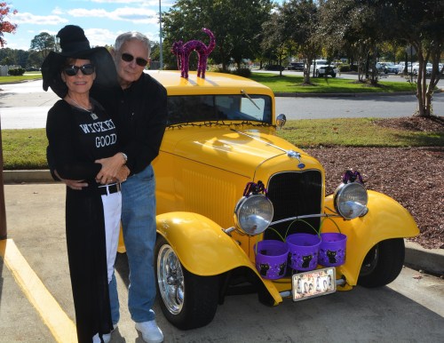 Saturday, my friend, Donna, and I attended the Trick or Treat Farmers Market. We wore our witch hats (again) and handed out candy to the trick-or-treaters. Our little yellow car (Vicky) was in a dress rehearsal for Sunday’s event, so it was a good photo op.