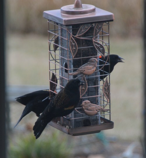 Although it’s difficult to see, there IS a bright spot in this next picture, too: that tiny flash of red on the wing of the blackbird on the back side 0f the feeder.