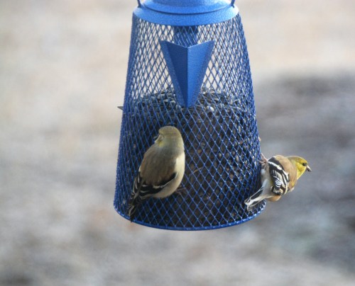 Although most of our visitors (other than the squirrels) are red-winged blackbirds, who come in droves, we do occasionally see other birds.  It’s always nice to see these sweet goldfinch, even in their drab winter colors.