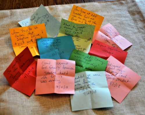 And, now, I will explain. Just before 2018 arrived, I saw a suggestion on Facebook to write little notes of thankfulness/gratitude/joy all through the year, place them in a container, and then read them on New Year’s Eve.