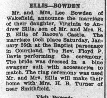 It is easy to become so caught up in that site that you lose track of time. Last week, I was preparing my upcoming “talk” for the Valentine event at Bacon’s Castle, so many of my thoughts were about my Mom and her family. I decided that it would be fun to search for articles about them, so I typed in her maiden name, “Ellis”.
