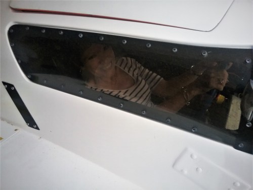 Motor Man thought it would be fun if I actually sat in the boat. There’s a ladder to climb up on this thing. It’s about 29 feet long and 14 feet wide and tilts on the trailer for transport on the highway.