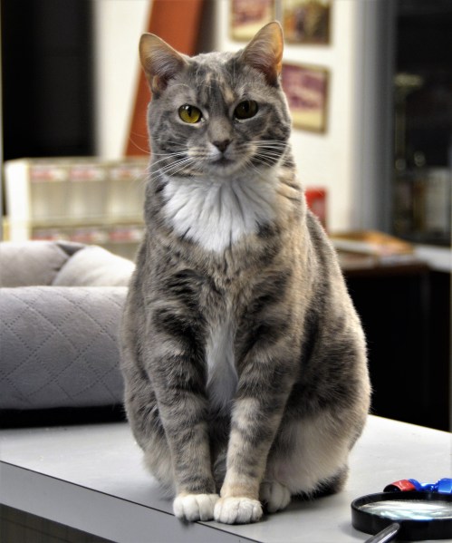 There’s something else that makes that resemblance even more convincing: Gypsy is our shop cat, and her bed is on the counter right as you enter the office. So, in a way, she DOES approve all of our guests.