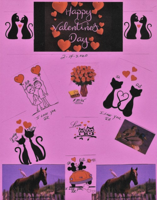 I think he covered just about everything: our kitties, Valentine’s roses, the ducks that I feed on a daily basis, “my” horses, the two of us in a convertible (?): he says that’s us at the beach, and us with heart-shaped balloons. By the way, his nickname is “JR”, and his nickname for me has been “DB” for over 40 years.