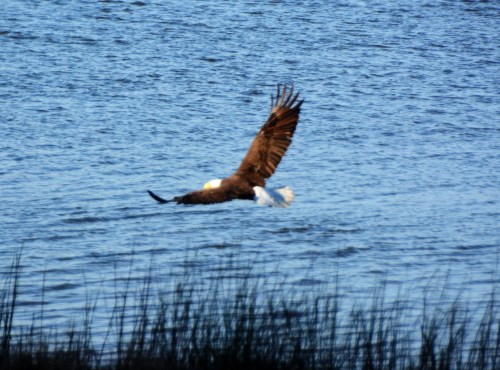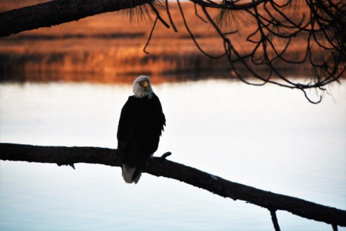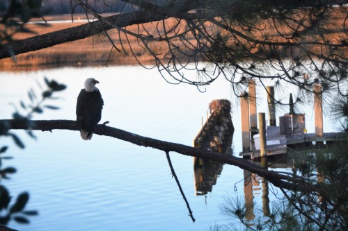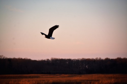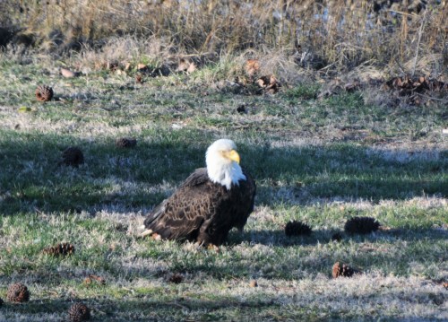 But, almost immediately, we wondered if he may be injured.  I opened our back door and, intentionally, wasn’t quiet about it.  He quickly put our minds at ease. (Later, I researched and learned that eagles DO “sit” on the ground, apparently for long periods of time.)
