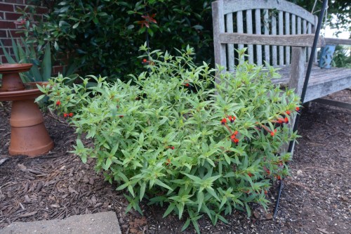 Curious about the plant that little one is nibbling on? I bought it because the tag stated: “attracts butterflies and hummingbirds”. Guess they forgot to include DEER. The name is Cuphea Ilavea, and the common name (oddly enough) is “Batface”. Here is another one of those plants, in a location in our yard which is apparently safe from the deer…so far.