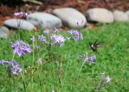 On day, I noticed a hummingbird visiting these pink flowers I planted just outside our bedroom window last year. My friend tells me the plant is “Society Garlic”. I like them because the foliage is green year-round, they have pretty pink blooms from spring til fall, AND the deer completely ignore them! It’s a bonus that hummingbirds are drawn to them.