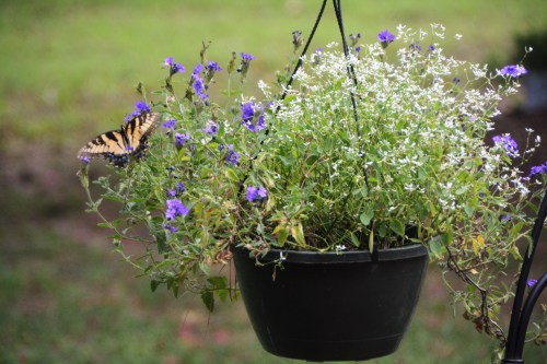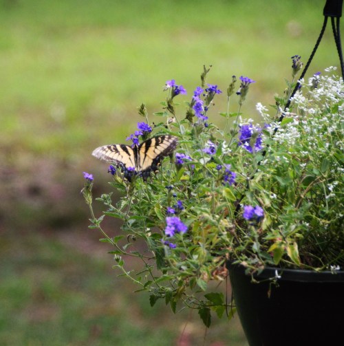 Recently, I caught sight of a swallowtail, enjoying the verbena in one of my hanging baskets.