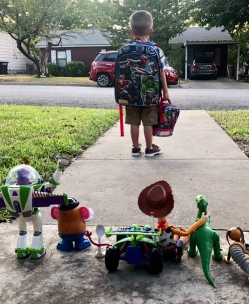 6. Love both pictures – Toy Story figures seeing the fellow off to school and Marshall with Hopefellow! Seeing so many fresh faces at school last week makes me wonder who/what saw them off to school too. SWEET!