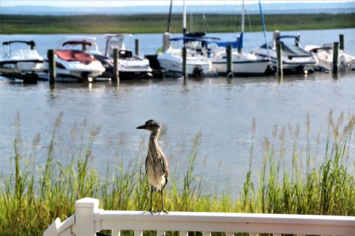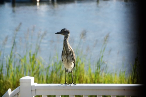 When Motor Man and I look out of our windows, we never know what we’ll see. Birds, ducks, deer, Canada geese, squirrels, or… an immature heron perched on our deck rail.