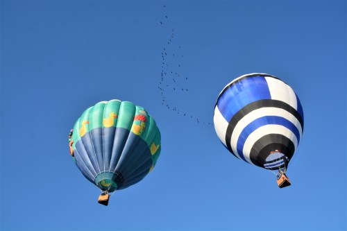 While the balloons were in flight, I noticed a flock of Canada geese flying near them. Afterward, Reed told us that the geese actually flew between the two balloons.