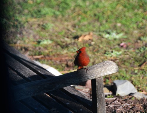 Since I’m a fan of ‘rustic’, I always like seeing a cardinal perched on the arm of the old wooden bench near the feeders. They seem to wait their turn here.