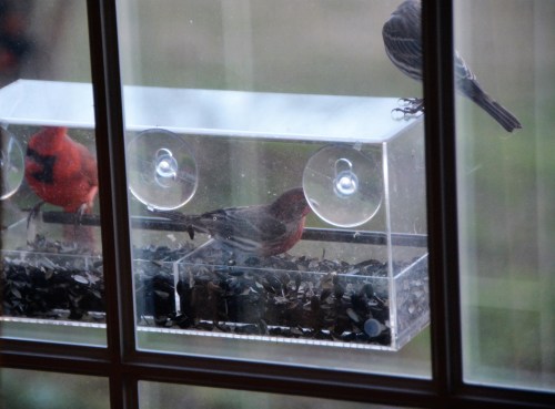 For Christmas last year, my friend, Donna, gave me this suction cup feeder to attach to a window. We put it in place back in the spring. For a long time, we had no takers, but Donna advised me to be patient: when the weather turned cold, they would come. Now, as you can see, there’s a wait.