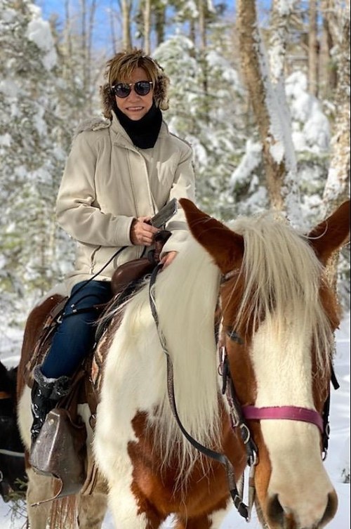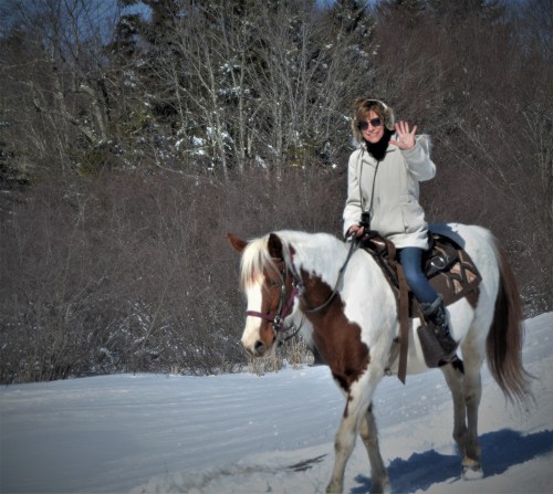 Later that morning, we returned to Snowshoe where I had a magical adventure: a trail ride in the snow. Skip’s wife, Peggy, was our guide, and a young couple on their honeymoon completed the group. Thankfully, the weather had improved greatly over the day before, as in warmer temperatures and no wind.