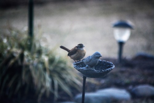 This sweet little wren recently landed near its look-alike on the stake bird feeder in the flowerbed in front of our kitchen windows.