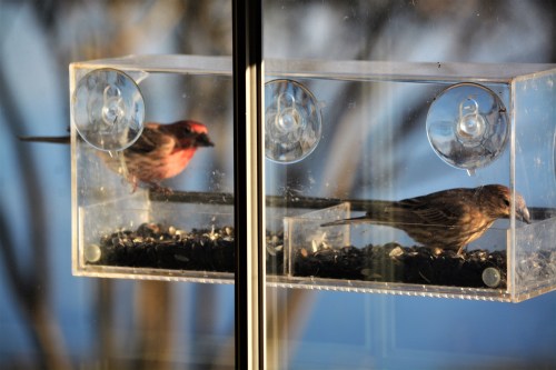 Recently, this house finch couple discovered the suction cup feeder that was a gift from my friend, Donna. You may recall this post about our raccoon visitor from a couple of months ago. Since then, we’ve moved the feeder higher on the window. We don’t believe the raccoons are able to reach it now, but we saw a squirrel jump from the window ledge to the feeder a few days ago.