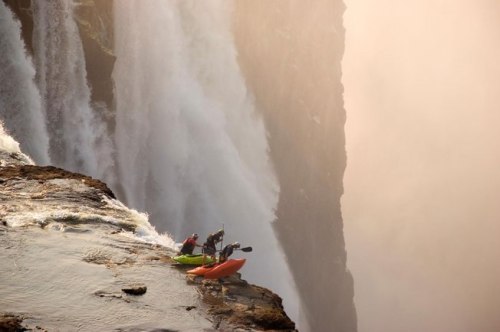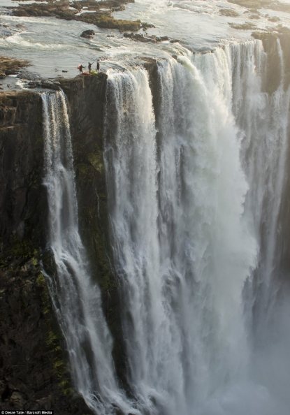 This is such an amazing picture, I did some research and learned exactly where it was taken. To recap: these are the Victoria Waterfalls, the largest in the world, located between Zambia and Zimbabwe. The three young men, two from South Africa and one from the US, are standing on one of the islands that are accessible during dry seasons. The photographer took the pictures from a helicopter. For more info and pictures, click here.