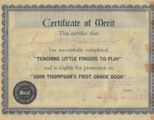 Somehow, I’ve managed to keep up with my first lesson book. AND, although I can barely read the filled-in- blanks on the “Certificate of Merit”, I can see that it was signed and dated by “Miss Cecile” upon my completion of that book: July 4, 1963.