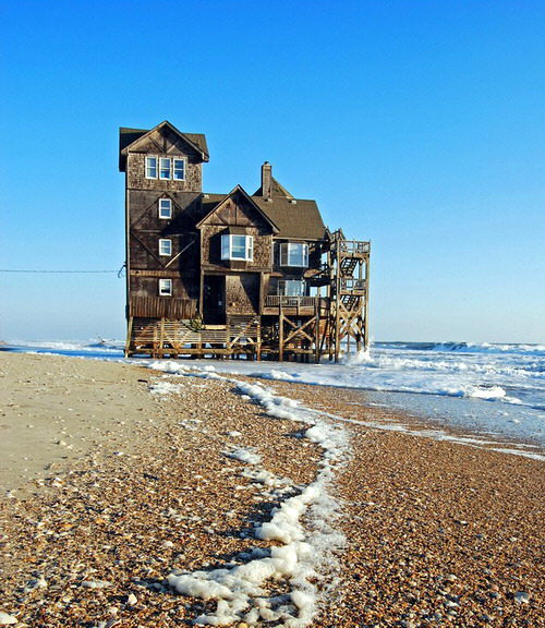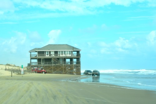 Although not nearly as fancy as the one in the above photo, I was reminded of this beach house at Corolla. This is “Laughing Gull”, and when there’s an extreme high tide, it is practically IN the ocean.